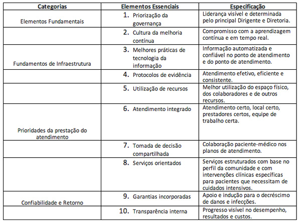 Quadro 1: Lista de elementos essenciais para prestar um atendimento de saúde de alto valor.