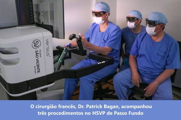 O Hospital São Vicente de Paulo (HSVP) de Passo Fundo realizou as primeiras cirurgias da especialidade torácica no interior do Rio Grande do Sul. Nesta semana, os médicos João Isidro Fracasso, Guilherme Macedo e Leonardo Priori conduziram o robô Versius em duas timectomias e uma segmentectomia pulmonar. O uso da plataforma foi acompanhado de perto pelo francês Dr. Patrick Bagan, um dos maiores cirurgiões torácicos do mundo.