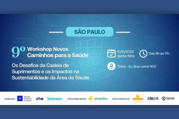As inscrições estão abertas para o 9º Workshop da Agenda Executiva – Novos Caminhos para a Saúde, que acontece no dia 10 de outubro (quinta-feira), em São Paulo. Com entrada gratuita, o evento será realizado na TOTVS (Av. Braz Leme, 1000, Santana, das 9h às 17h).