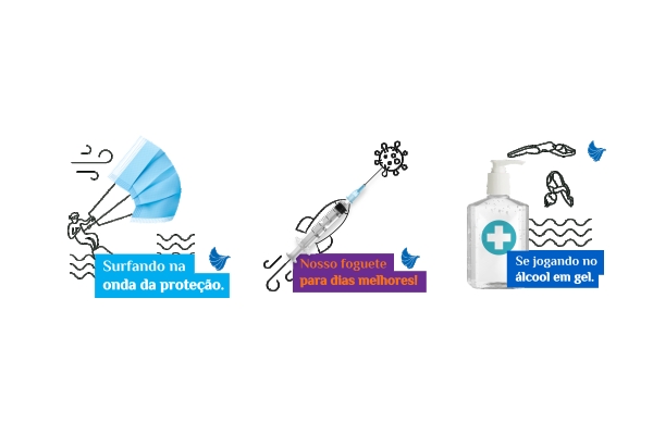 O desafio contínuo desde o início da pandemia é incentivar que todos sigam as medidas de prevenção contra a COVID-19. O Hospital Moinhos de Vento apostou em uma nova abordagem, mais leve e descontraída, para relembrar as orientações, dicas e protocolos que já são conhecidos por todos. As mensagens “Se jogando no álcool em gel”, “Nosso foguete para dias melhores” (alusivo à vacina) e “Surfando na onda da proteção” (chamando atenção para o uso da máscara) estão em figurinhas para WhatsApp e peças gráficas divulgadas nos canais internos e nas redes sociais da instituição.