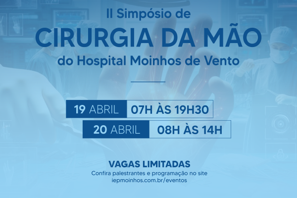 O Hospital Moinhos de Vento realizará, nos dias 19 e 20 de abril (sexta-feira e sábado), a segunda edição do Simpósio de Cirurgia da Mão. O evento será presencial, no Anfiteatro Schwester Hilda Sturm.