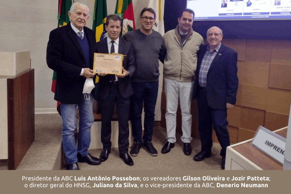 O presidente da Associação Beneficente Canoas (ABC), Luis Antônio Possebon, o vice-presidente Denerio Neumann, e o diretor geral do HNSG, Juliano da Silva, receberam uma placa em homenagem ao aniversário. A homenagem foi uma proposta dos vereadores Gilson Oliveira e Jozir Patteta.