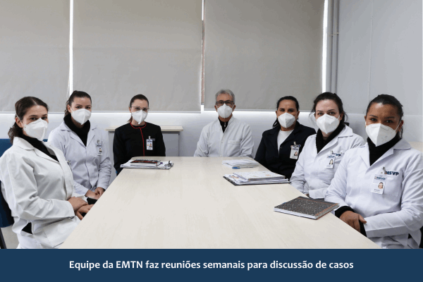 A EMTN se reúne semanalmente para discussões de casos clínicos, elaboração de rotinas, protocolos e juntamente com a Nutrição Clínica, acompanha diariamente todos os pacientes em terapia nutricional. Além do monitoramento aos pacientes, a equipe realiza capacitações e treinamentos internos e externos aos profissionais de saúde envolvidos com Terapia Nutricional.