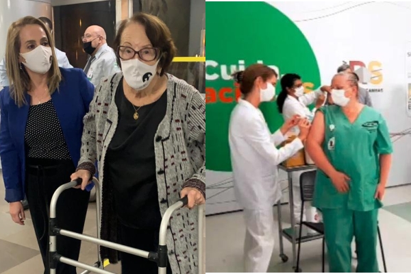 Cinco pessoas receberam, simultaneamente, a imunização. Representando a população idosa, foi vacinada a porto-alegrense Eloína Gonçalves Born. Aos 99 anos, ela mantém a mesma lucidez e empolgação de outrora. E, desde cedo nesta segunda-feira, já estava com figurino e bijuterias prontas para o momento tão aguardado. “É uma grande emoção. Estava ansiosa por isso”, disse Eloína que, em julho, completará seu centenário. Moradora do Donna Care Lar de Idosos e ainda com muita vontade de viver, quer celebrar seus 100 anos mais próxima da família.