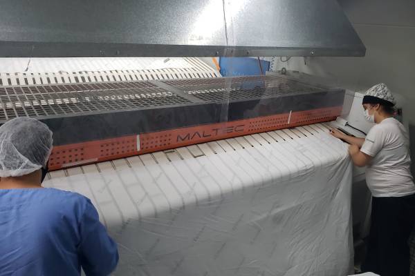 O Tacchini Sistema de Saúde do Rio Grande do Sul colocou em funcionamento, nos últimos dias, uma calandra com dobradeira. O equipamento é capaz de passar e dobrar roupas automaticamente de forma ágil, fornecendo pilhas de peças já contabilizadas. A máquina é capaz de absorver toda a demanda da lavanderia dos hospitais São Roque, de Carlos Barbosa, e Tacchini, em Bento Gonçalves. Juntos, os hospitais do Tacchini Sistema de Saúde consomem, em média, 100 toneladas de roupas por mês, incluindo lençóis, fronhas, camisolas, entre outras peças utilizadas pelos pacientes.