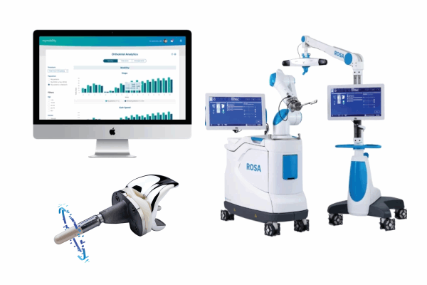 O sucesso das cirurgias robóticas, em termos de precisão e personalização, deve-se especialmente às tecnologias integradas, que lideram igualmente as tendências para os próximos anos. Plataformas como a OrthoIntel, aplicadas ao ROSA, combina dados pré, intra e pós-operatórios dos pacientes, alinhando informações diagnósticas às captadas por meio do mymobility, um aplicativo disponível nos sistemas iOS e Android, que reúne dados quantitativos e qualitativos do paciente, como por exemplo, a quantidade de passos dados ao longo do dia, lances de escada que ele subiu, adesão aos exercícios, frequência cardíaca, velocidade de marcha, assimetria, detecção de quedas e sono.