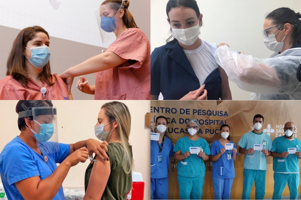Na quarta-feira (20), chegaram ao Hospital São Lucas da PUC-RS (HSL-PUCRS) as doses destinadas à vacinação contra o coronavírus. A imunização começou a ser ministrada às 11h30, sendo destinada a cinco colaboradores do grupo prioritário da primeira fase da imunização: profissionais da linha de frente contra a Covid-19, que atuam nas unidades de internação, Unidade de Terapia Intensiva (UTI) e Emergência. Os demais funcionários serão chamados para o processo de vacinação gradativamente, evitando aglomerações.
